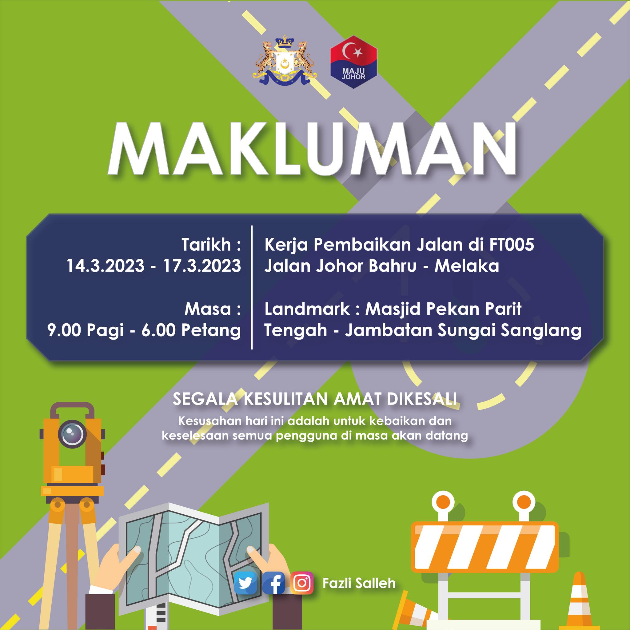 Kerja-kerja membaikpulih pada fasa pertama melibatkan jalan di FT005 Jalan Johor Bahru – Melaka yang akan ditutup untuk satu lorong sepanjang tiga kilometer selama empat hari bermula 14 Mac 2023 sehingga 17 Mac 2023 / Sumber Gambar Facebook Fazli Salleh.