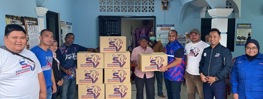 Presiden Majlis Belia Negeri Johor (MBNJ), Salleheen Mohamad bersama sukarelawan Southern Volunteers (SV) menyampaikan sumbangan Balairaya Kampung Batu Badak.