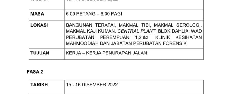 “Bagi fasa ini, kerja akan dilakukan di kawasan Blok Anggerik, Blok Bunga Raya, Blok Cempaka, Jabatan Radiologi, Jabatan Dietetik dan Sajian, Pusat Bersalin, Bangunan L&D dan simpang Blok Rafflesia pada waktu yang sama,” katanya.