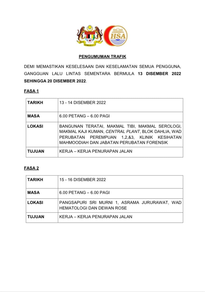 Notis penurapan jalan yang akan dilaksanakan di Hospital Sultanah Aminah Johor Bahru bermula 13 hingga 20 Disember ini / Gambar Ihsan HSAJB