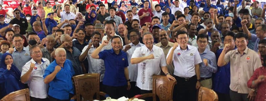 Lee Ting Han (empat, kanan) bersama Menteri Besar Johor, Datuk Onn Hafiz Ghazi dan Menteri Pertahanan, Datuk Seri Hishammuddin Hussein pada Majlis Ramah Mesra Bersama Rakyat Parlimen Sembrong / Sumber Facebook Lee Ting Han