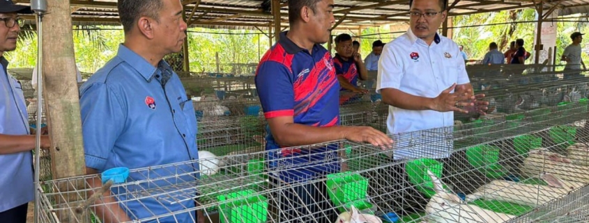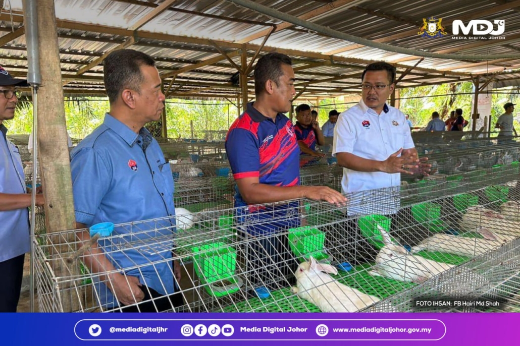 Pengerusi Jawatankuasa Belia, Sukan, Pembangunan Usahawan, Koperasi dan Sumber Manusia Negeri Johor, Mohd Hairi Mad Shah melawat ladang yang menempatkan kira-kira 800 ternakan arnab pedaging ini yang dipelihara dalam kawasan yang bersih, diselenggara dan bersistematik. | Foto ihsan Facebook Hairi Md Shah