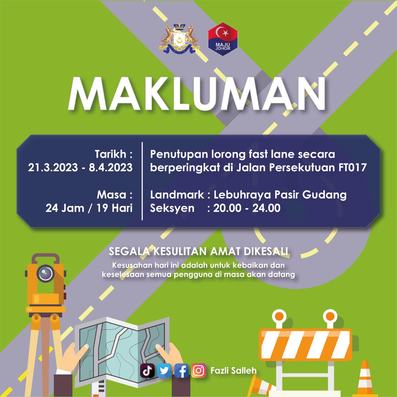 Pengerusi Jawatankuasa Kerja Raya, Pengangkutan dan Infrastruktur Negeri Johor, Ir Ts Mohamad Fazli Mohamad Salleh memaklumkan lebuh raya Pasir Gudang ditutup untuk satu lorong sepanjang empat kilometer (KM) selama 19 hari / Sumber Foto Facebook Fazli Salleh.