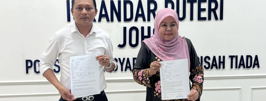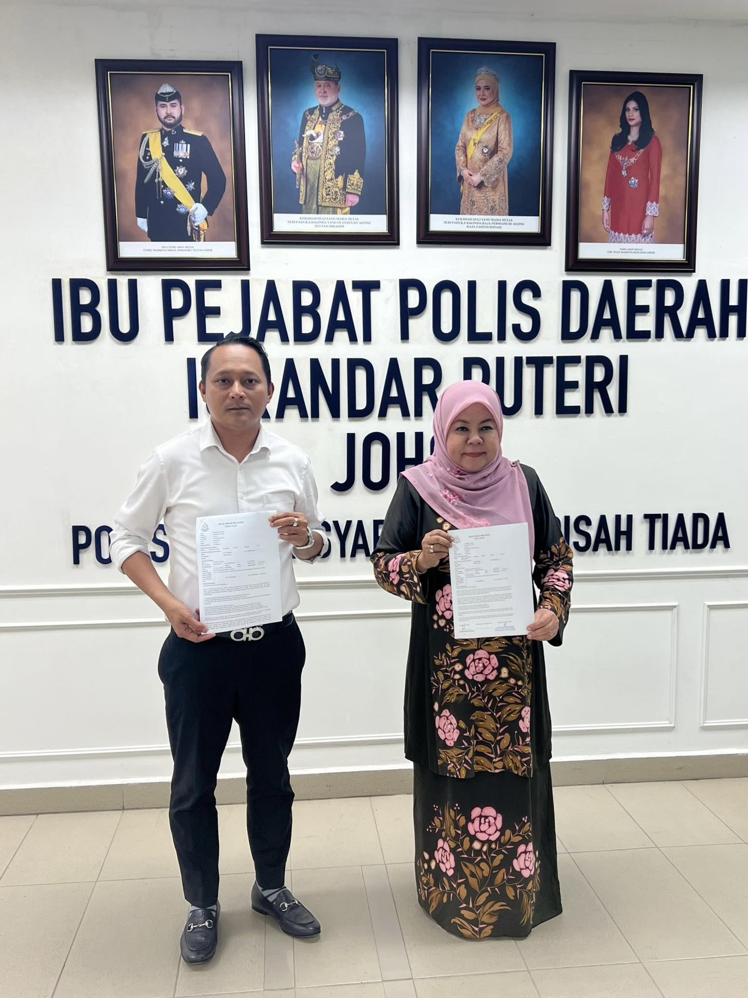 YB Tuan Aznan Tamin dan YB Puan Hajah Khairin-Nisa Ismail membuat laporan polis berhubung penghinaan terhadap DYAM Tunku Mahkota Ismail, Pemangku Sultan Johor. | Foto FB Aznan Tamin