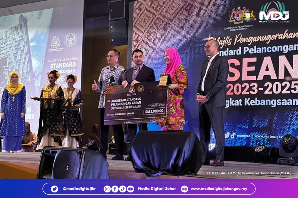 Majlis Bandaraya Johor Bahru (MBJB) semasa menerima pengiktirafan di Majlis Penyampaian Anugerah Standard Pelancongan ASEAN Tahun 2023-2025 (Peringkat Kebangsaan), semalam. | Foto ihsan Facebook Majlis Bandaraya Johor Bahru (MBJB)