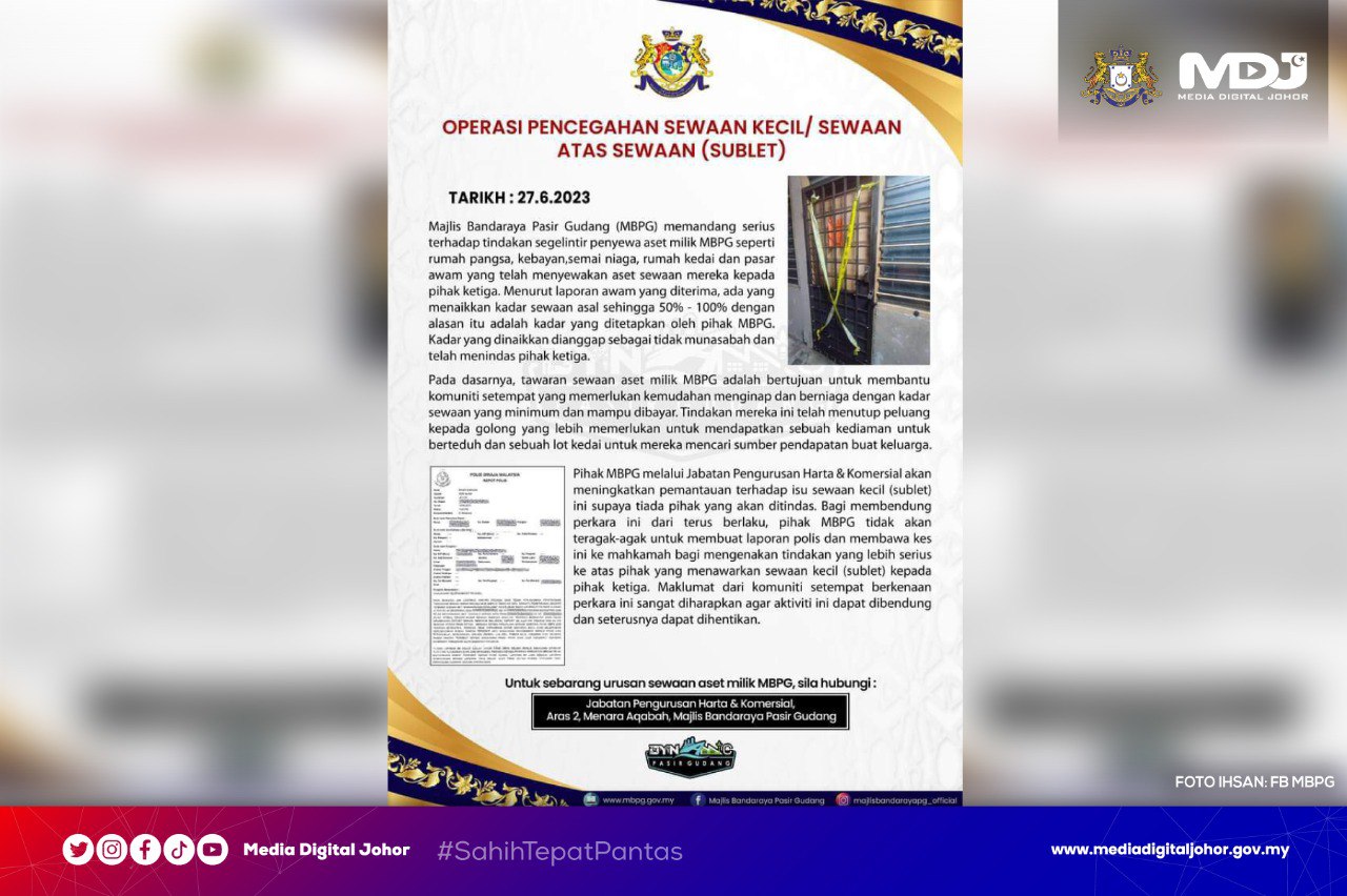 ISKANDAR PUTERI — Majlis Bandaraya Pasir Gudang (MBPG) memandang serius tindakan segelintir penyewa menyewakan aset sewaan milik pihak berkuasa tempatan (PBT) berkenaan kepada pihak ketiga.