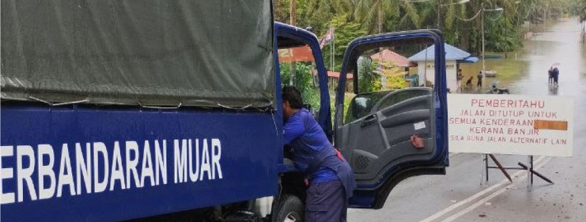 Lori Majlis Perbandaran Muar (MPM) yang membawa muatan tilam, cadar dan keperluan lain untuk mangsa banjir terpaksa berhenti berikutan laluan Kampung Lenga – Bukit Kepong dinaiki air sedalam kira-kira 1 meter / Gambar MDJ Badrul Kamal Zakaria.