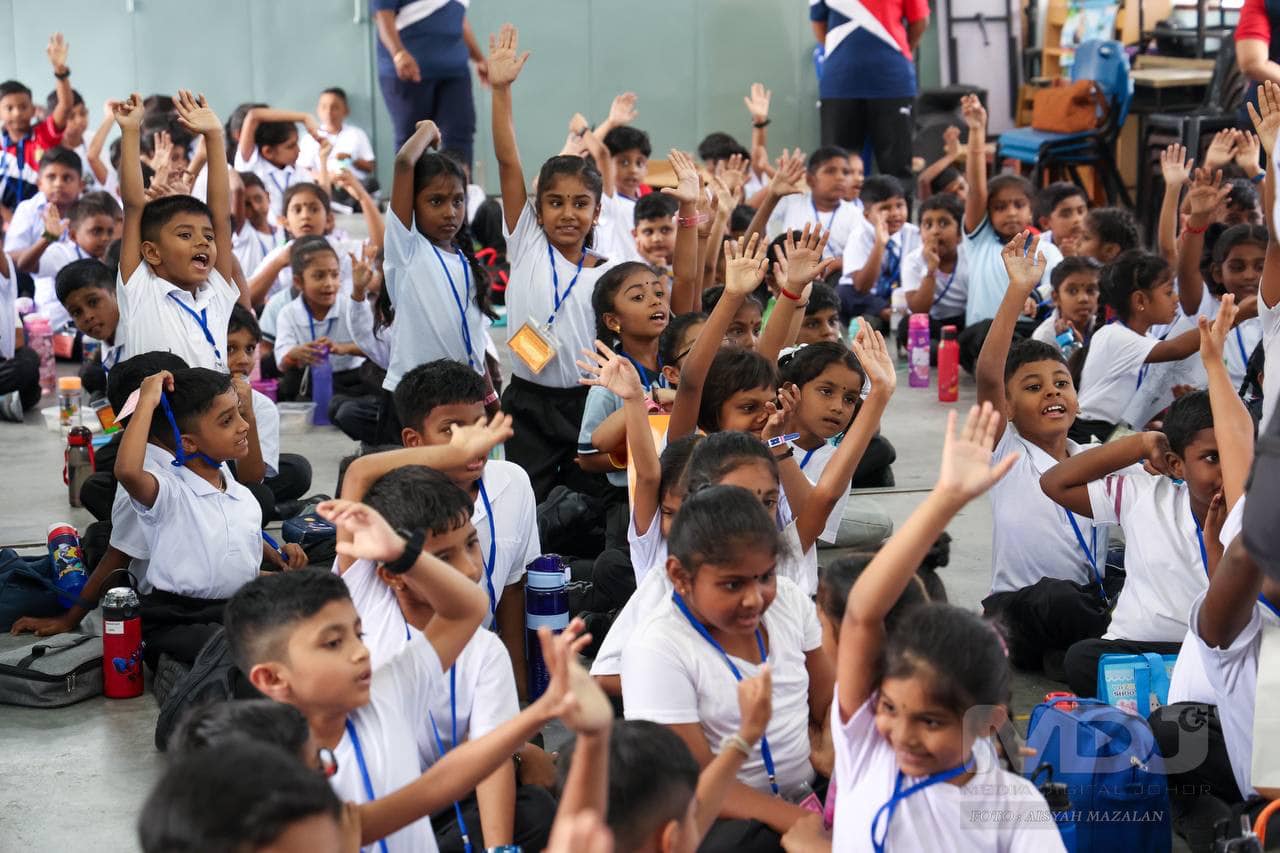 Murid Tahun Satu Sekolah Jenis Kebangsaan Tamil (SJKT) Taman Tun Aminah, Johor Bahru menerima kit persekolahan daripada Kerajaan Negeri menerusi Yayasan Sultanah Rogayah. | Foto MDJ Aisyah Mazalan