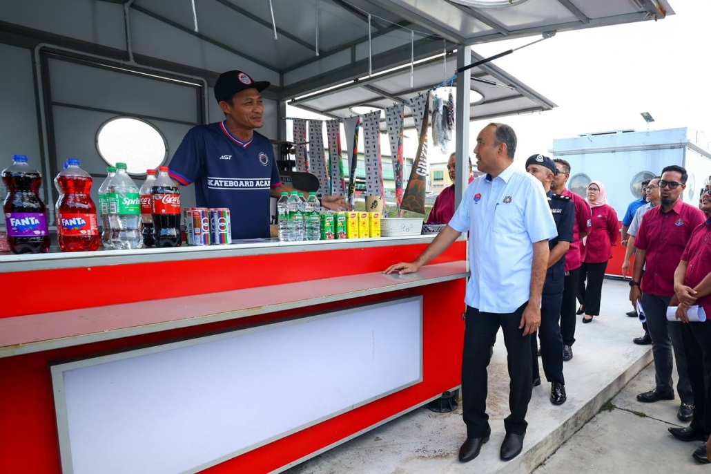YB Dato’ Mohd Jafni Md Shukor, Pengerusi Jawatankuasa Perumahan dan Kerajaan Tempatan Negeri Johor melakukan tinjauan ke salah satu pondok niaga disediakan KPKT. | Foto MDJ Wira Anggara
