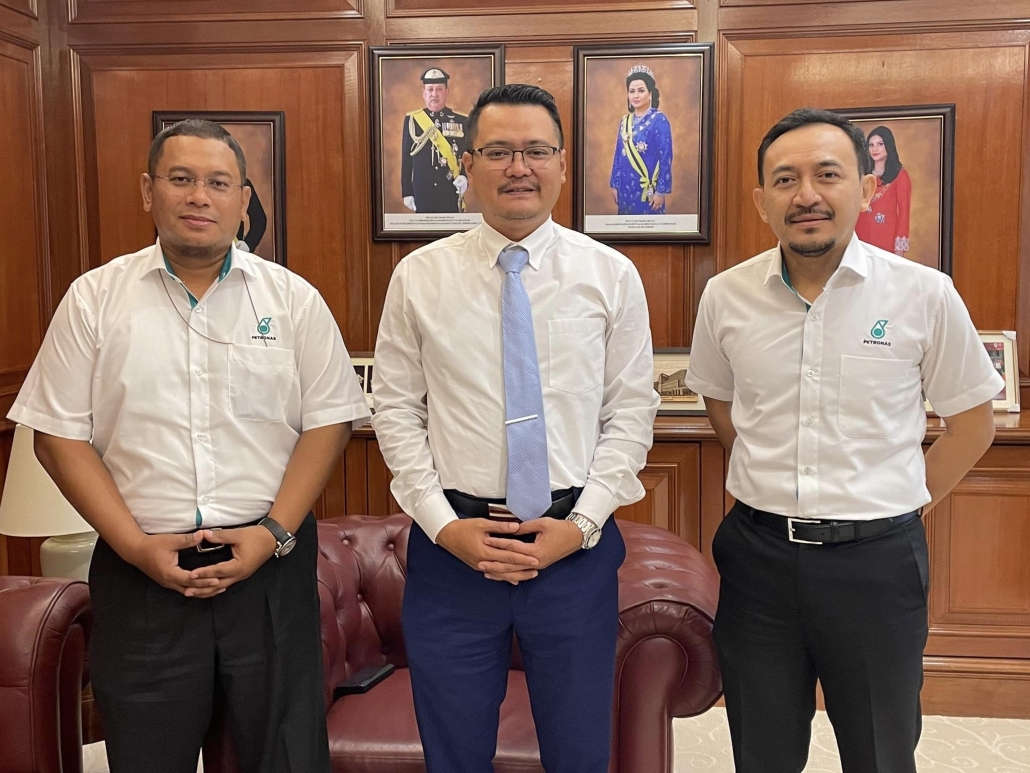 EXCO Kerajaan Johor, Mohd Hairi Mad Shah terima kunjungan Pengurus Besar PETRONAS Selatan, Mohd Zaki Mahat dan Pengurus Hal Ehwal Kerajaan PETRONAS Selatan, Syafrul Faisyah M Jafri, semalam | Sumber gambar Facebook Hairi Md Shah.