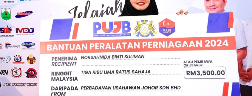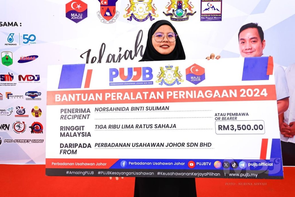 Usahawan berasal dari Tangkak ini menerima geran Bantuan Peralatan Perniagaan 2024 Perbadanan Usahawan Johor Sdn. Bhd (PUJB) disampaikan oleh YB Dato’ Onn Jabbar, Timbalan Setiausaha Kerajaan Johor (Sukan, Belia dan Sukarelawan), sempena Jelajah Aspirasi Orang Muda Johor @ Tangkak di Litar Lumba Tangkak.