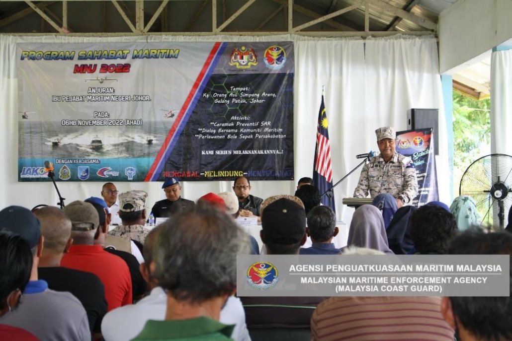 ISKANDAR PUTERI — Agensi Penguatkuasaan Maritim Malaysia (Maritim Malaysia) Negeri Johor mengadakan lawatan muhibbah bersama komuniti nelayan Orang Asli di Kampung Simpang Arang, Gelang Patah.