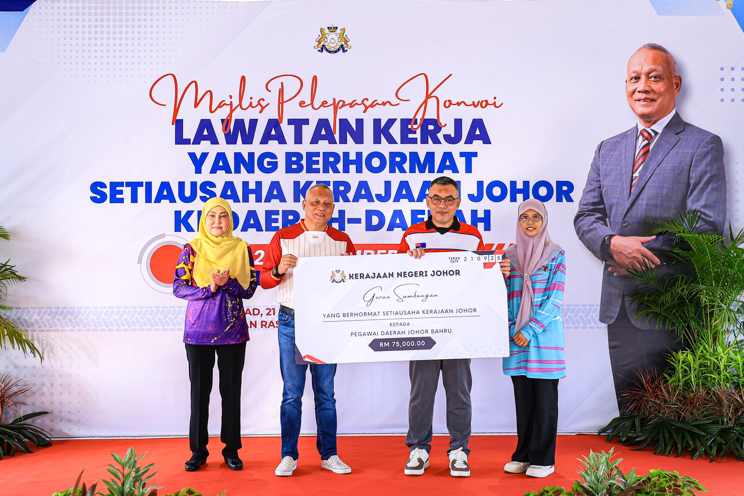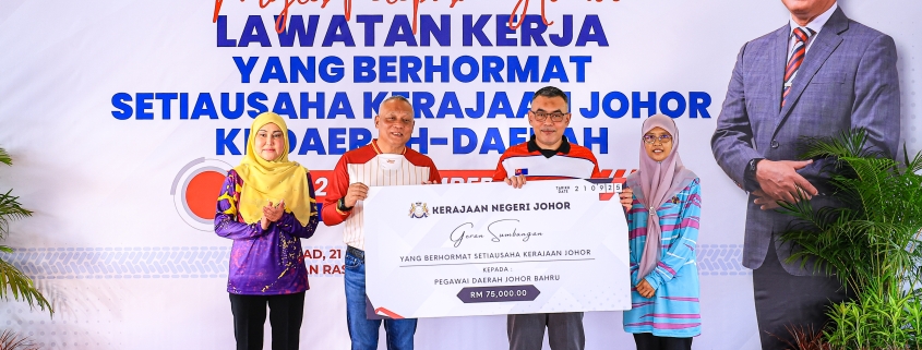 Pengisian lawatan kerja bermula dengan penyerahan geran bantuan berjumlah RM75,000 kepada YBhg. Encik Mohd Masni Wakiman, Pegawai Daerah Johor Bahru dan PUSPANITA Cawangan Daerah Johor Bahru di Kediaman Rasmi Setiausaha Kerajaan Negeri Johor pagi tadi.
