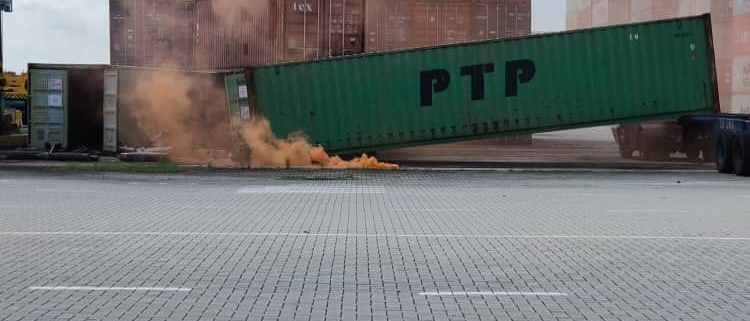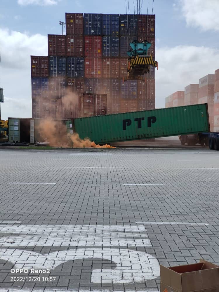 ISKANDAR PUTERI — Kontena berisi 40 silinder mengandungi gas klorin seberat empat tan ‘terjatuh’ ketika proses memuatkan kontena ke penggerak utama dalam kejadian di Pelabuhan Tanjung Pelepas (PTP), semalam.