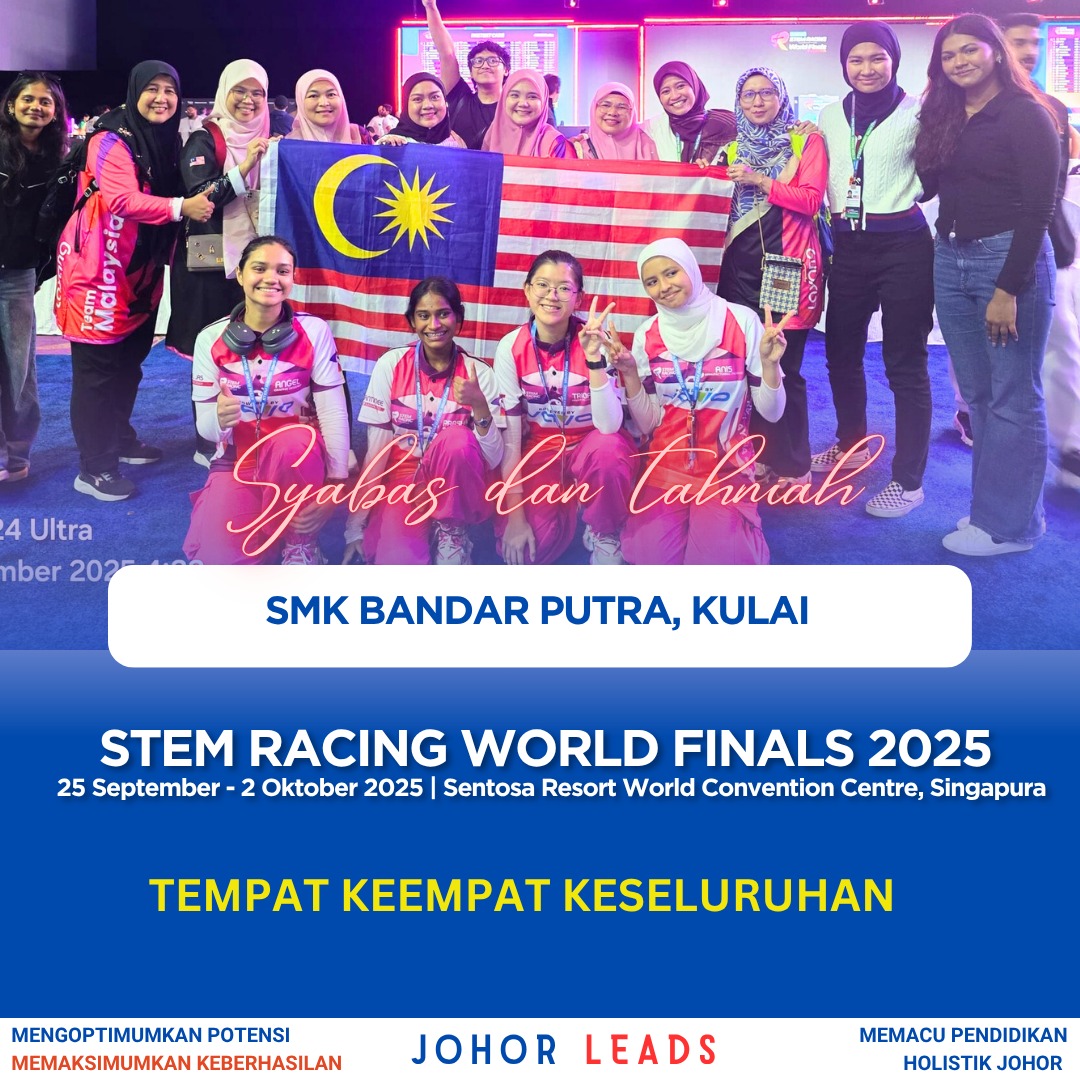 #IskandarPuteri – Pasukan Sekolah Menengah Kebangsaan (SMK) Bandar Putra, Kulai, melakar sejarahnya yang tersendiri apabila berjaya menduduki tempat keempat terbaik dunia dalam STEM Racing World Finals 2025 yang berlangsung di Sentosa Resort World Convention Centre, Singapura, dari 25 September hingga 2 Oktober lalu.