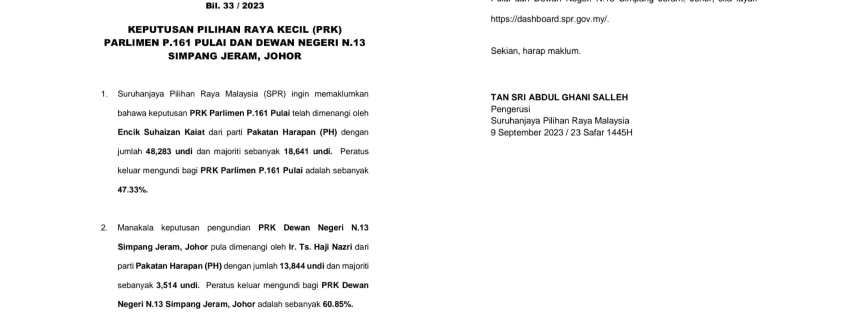 Kenyataan media oleh Suruhanjaya Pilihan Raya Malaysia berkenaan keputusan Pilihan Raya Kecil (PRK) Parlimen P.161 Pulai dan Dewan Negeri N.13 Simpang Jeram, Johor.