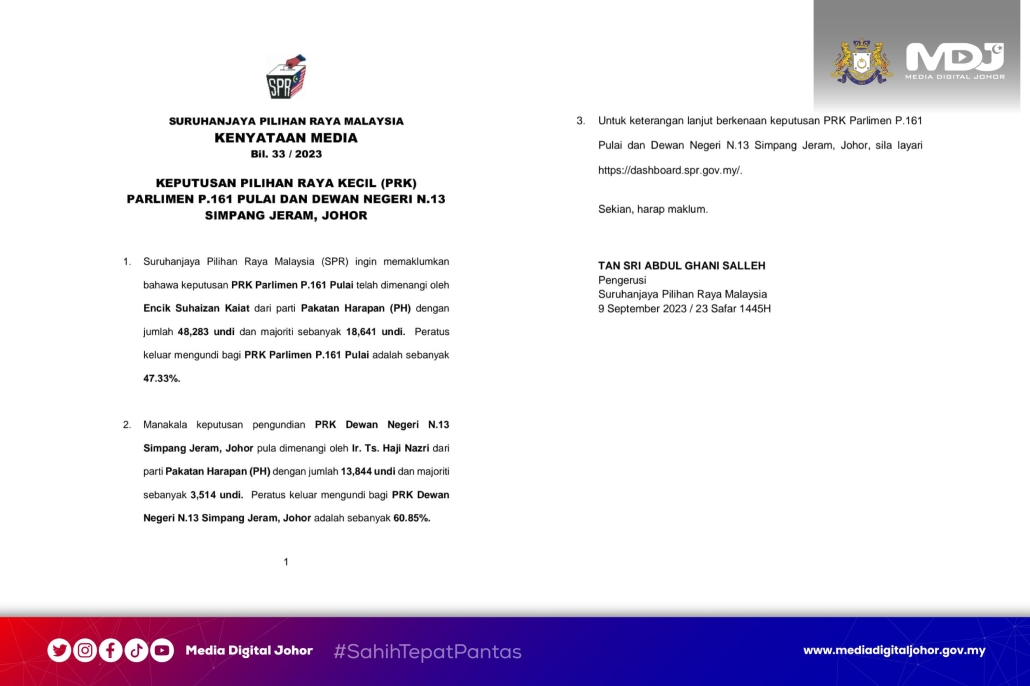 Kenyataan media oleh Suruhanjaya Pilihan Raya Malaysia berkenaan keputusan Pilihan Raya Kecil (PRK) Parlimen P.161 Pulai dan Dewan Negeri N.13 Simpang Jeram, Johor.