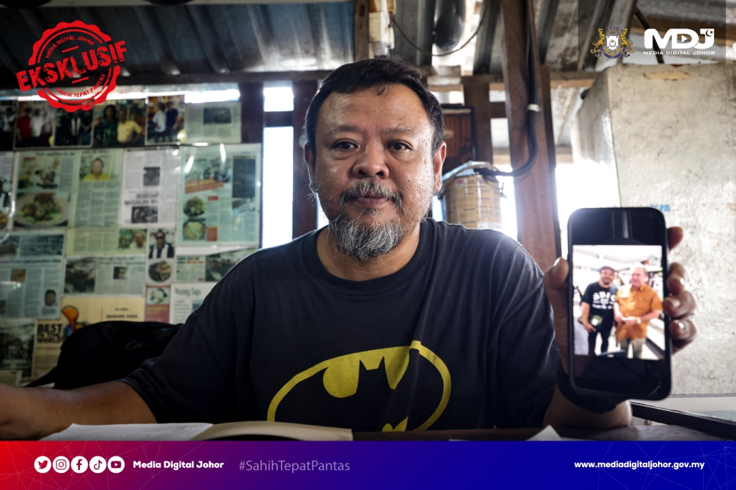 Pengusaha Warung Saga, Ahmad Ismail menunjukkan gambar kenangan beliau bersama DYMM Sultan Johor, Sultan Ibrahim Ibni Almarhum Sultan Iskandar. | Foto MDJ Nurina Aisyah.