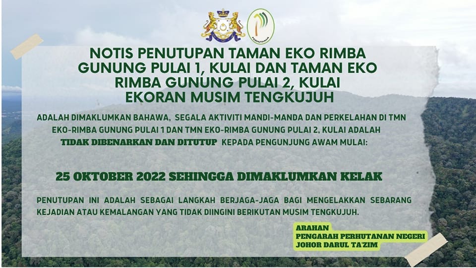 “Adalah dimaklumkan segala aktiviti mandi-manda dan perkelahan di Taman Eko-Rimba Gunung Pulai 1 serta Gunung Pulai 2 tidak dibenarkan dan ditutup kepada pengunjung awam mulai 25 Oktober (semalam) sehingga ke satu tarikh yang akan dimaklumkan kemudian.