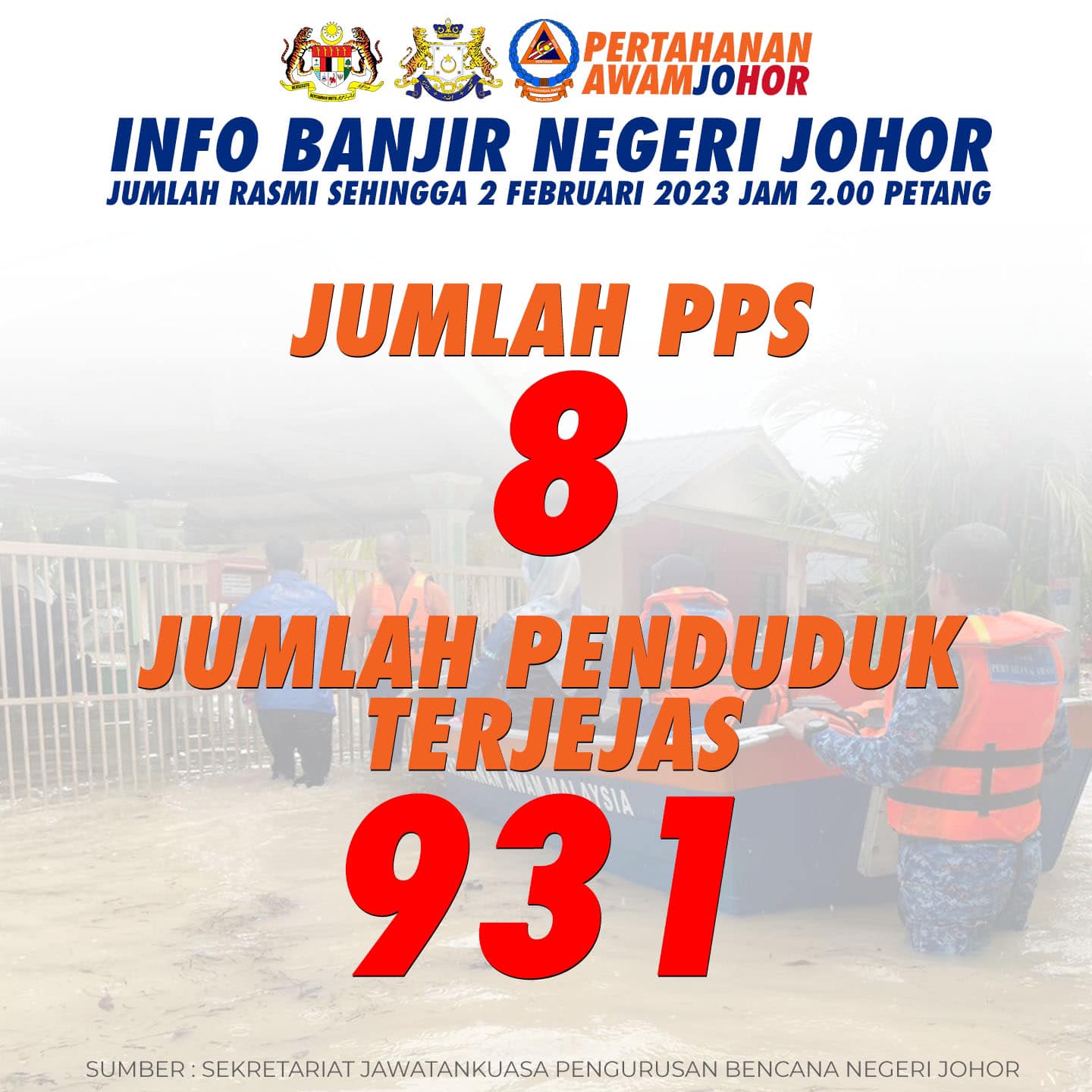 Setiausaha Kerajaan Johor, Tan Sri Dato’ Dr. Azmi Rohani berkata, jumlah terkini mangsa yang berada di Pusat Pemindahan Sementara (PPS) adalah 931 orang daripada 266 keluarga.