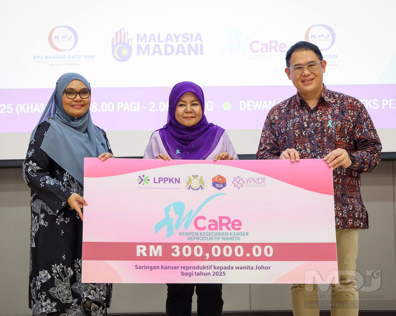 YB Puan Khairin-Nisa Ismail, Pengerusi Jawatankuasa Pembangunan Wanita, Keluarga dan Masyarakat Negeri Johor (tengah) menyerahkan cek cura kepada YBrs. Dr. Salmi Jalina Jalil, Pengarah LPPKN Negeri Johor (kiri) bagi pelaksanaan Program Kesedaran Reproduktif Wanita (WCaRe). | Foto MDJ Aisyah Mazalan